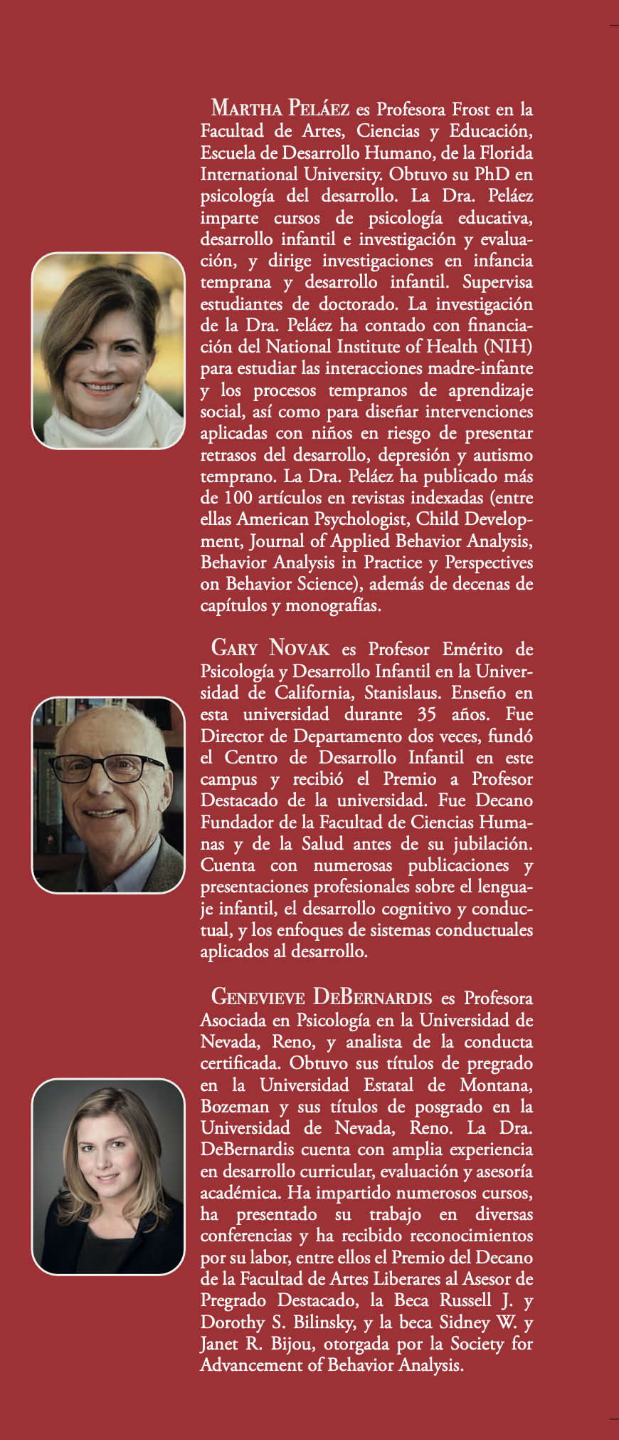 Genevieve DeBernardis es Profesora Asociada de Psicología en la Universidad de Nevada, Reno, y también cuenta con la certificación de analista de la conducta. Posee una amplia experiencia en desarrollo curricular, evaluación y asesoría académica, labor por la que ha recibido el Premio del Decano al Asesor de Pregrado Destacado. Además, ha sido distinguida con las becas Russell J. y Dorothy S. Bilinsky, y la beca Sidney W. y Janet R. Bijou otorgada por la Society for Advancement of Behavior Analysis.