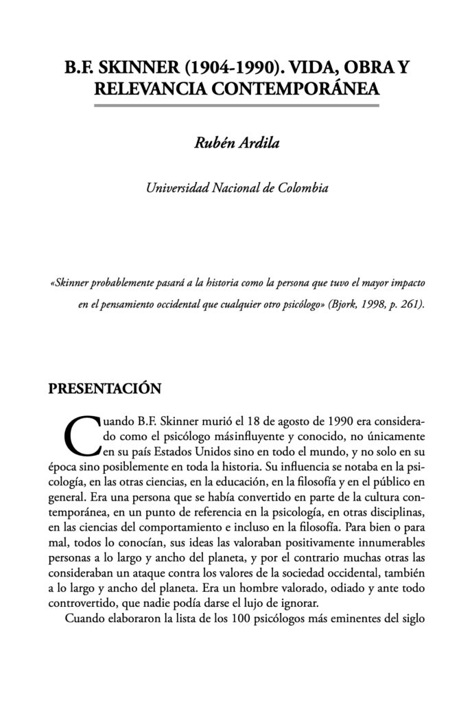 Rubén Ardila ha colaborado con Co-presencias Editorial en el libro «B.F. Skinner revisitado», con el capítulo titulado: B.F SKINNER (1904-1990). VIDA, OBRA Y RELEVANCIA CONTEMPORÁNEA. Hace un repaso de su obra, inventariando gran parte de sus escritos y expone, con la claridad a la que nos tiene acostumbrados, la actualidad de Skinner en nuestro siglo.